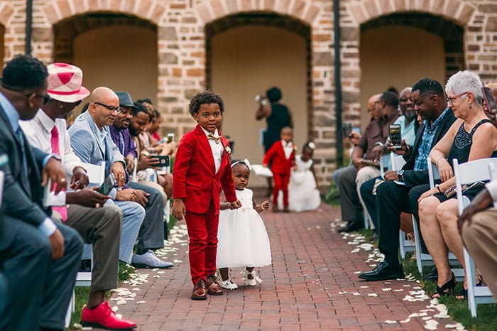 Five-year-old Bryson Suber was looking sharp in his red tuxedo when he served as a ring bearer at his parents’ wedding ceremony.