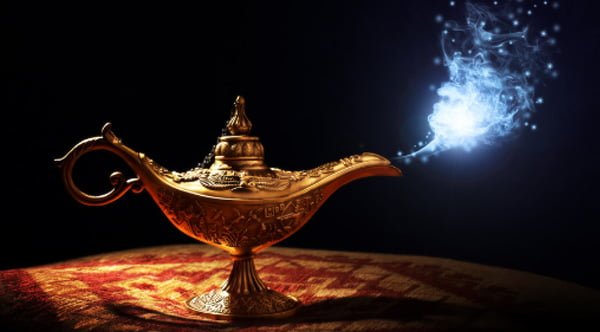 A man finds an ancient oil lamp and out comes an all powerful genie.