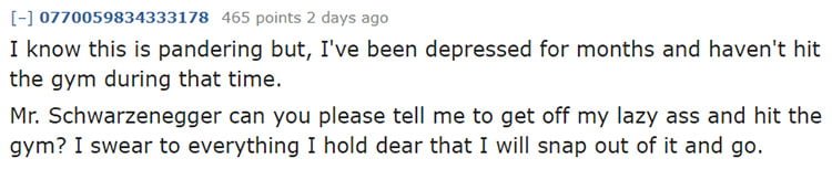 A user on the forum, who says he's been depressed lately, reached out to the 7-time Mr. Olympia for some motivation.