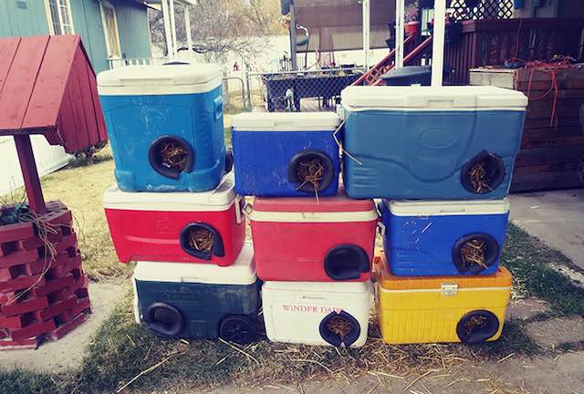 Using a 6-inch drill bit, Rogich crafts each “cat cooler” shelter by cutting out a hole in the side of the cooler. Once he lines the holes with strips of pipe insulation foam, he fills the cooler with straw for bedding.
