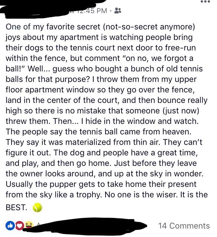 We stumbled across this Facebook post from a guy that throws tennis balls from his apartment balcony to the dogs in the tennis court below.