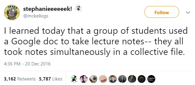 It was posted on Twitter by PhD student Stephanie McKellop, who realized that students were using Google Docs to collaboratively take lecture notes. By doing so, they could all help one another and save a lot of time during class.