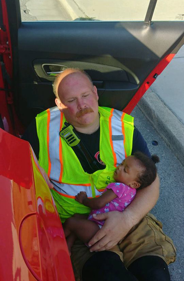 So I took her out of her car seat and did a quick physical exam to make sure she was okay. She immediately laid her head on my shoulder. Shortly after that I decided that my guys had the scene under control, so I decided to sit and take a break with my new friend. She immediately fell asleep in my arms. Mom was transported and Engine 6 personnel stayed on scene with the children until they were turned over to family members. It's moments like this, that I am reminded, this is why I do the job."