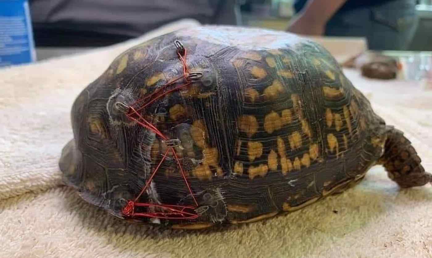 Many of the turtles have suffered damage to their shell after being hit by a lawnmower, car, or motorized vehicle. Thankfully, the rescuers have managed to fix the reptile shells by gluing the pieces together and using bra clasps to secure the shell with wire.
