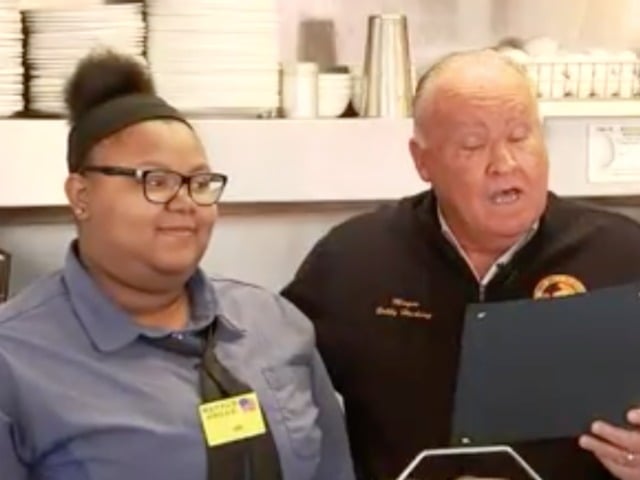 “I was just like, ‘Sure! If you need help, that’s what I am here for,’ ” the 18-year-old waitress said. “My cook was calling my name to pick up food I had on the board, but I continued to cut his ham.”