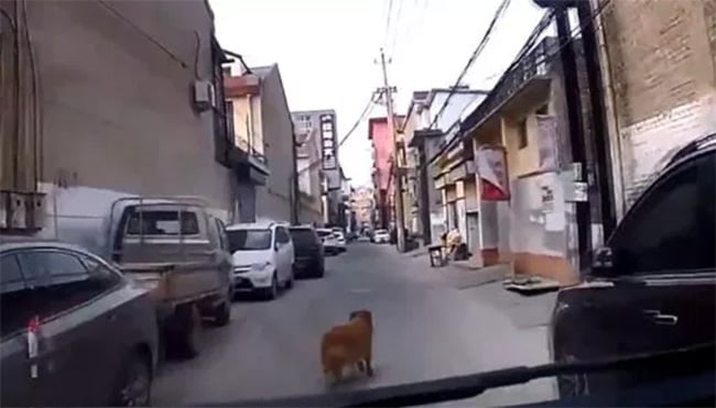Dashcam footage shows the dog anxiously looking over its shoulder several times in order to make sure the paramedics are following it before the pup picks up speed and runs through the maze of alleyways.